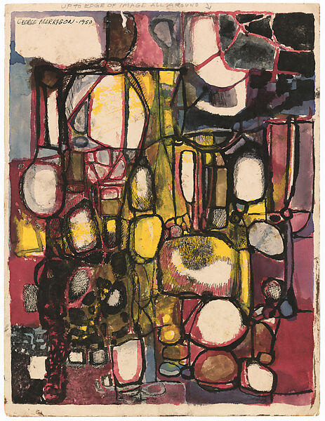 During his years there, Morrison showed alongside such artists as Lois Dodd and Louise Nevelson, knew Jackson Pollock from going to the Cedar Bar, and befriended Kline, who also had a bad leg and who became godfather to his son Briand Mesaba Morrison. He appeared in multiple group exhibitions, including Whitney annuals and some in venues outside the city, and received some critical attention. In 1948, when de Kooning first showed at the Egan Gallery, Morrison had his first solo at the Grand Central Galleries. Neither flaunting nor denying his Indian heritage, he frequently attended Native performances and visited Native American friends. But New York let him feel the modernist, universalist spirit, and he was particularly inspired by Jungian ideas about the unconscious. Though he had a Chippewa name, he signed his work “George Morrison” throughout his life.