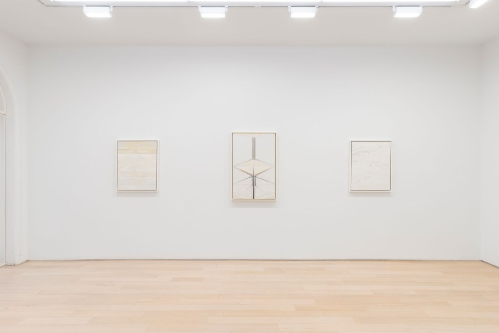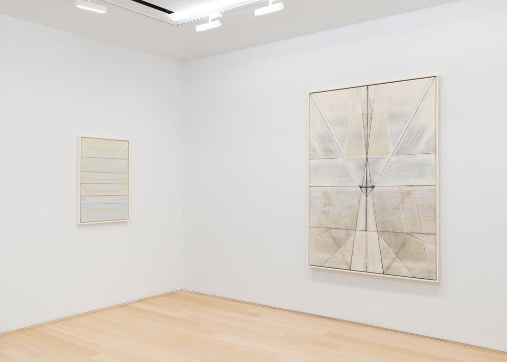 The concept of infinite space lies at the heart of the exhibition. In each varied work, diaphanous lines, measured linear gestures, and whispered forms evolve from a dusty, empty dreamlike space. Color appears sunbaked or sandblasted. It’s as if what is visible has become translucent and corporeal weight has given way to a spectral presence that feels less like a painted object and more like a passing breath. Rather than megaphonic declarations, Sterne offers muted hues that refract across the surface, creating subtle shifts in tone and depth. Like in an untitled 1983 piece, horizontal marks slant and tilt into vivid prismatic planes. Color for Sterne hovers, intersects, and dissolves.