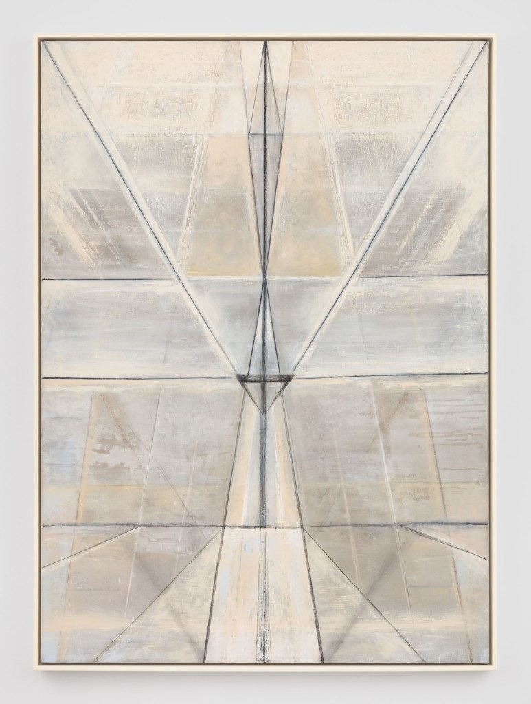 Line was integral to Sterne’s work and she worked for it. The largest painting in the exhibition – an untitled painting from 1985 – manifests extraordinary prismatic restraint and structural discipline. Though inspired by urban architecture – linear frameworks, scaffolding forms, and grid-like intervals – she eschews its literal depiction. Instead, she establishes an architecture-of-perspectives based on the physical layout of the canvas, transformed into a poetic, cathedral-like armature. Space is constructed, destabilized, and reimagined.