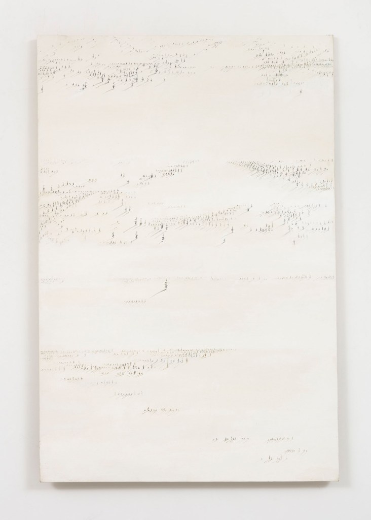 Underscoring her resistance to a fixed style, the exhibition presents a delicate series of paintings titled “Signs.” Rarely exhibited and unique in Sterne’s predominantly gestural and graphic oeuvre, they build on the metaphysical space established by the “Vertical Horizontal” series. Like elegant calligraphy, tiny marks are scattered across the surface. Each seems to cast a shadow that makes it seem totemic and, beyond that, anthropomorphic, like a crowd of revelers assembling or dispersing. “With time I have learned to lose my identity while drawing and to act simply like a conduit, permitting visions that want to take shape to do so,” Sterne said in 2006.