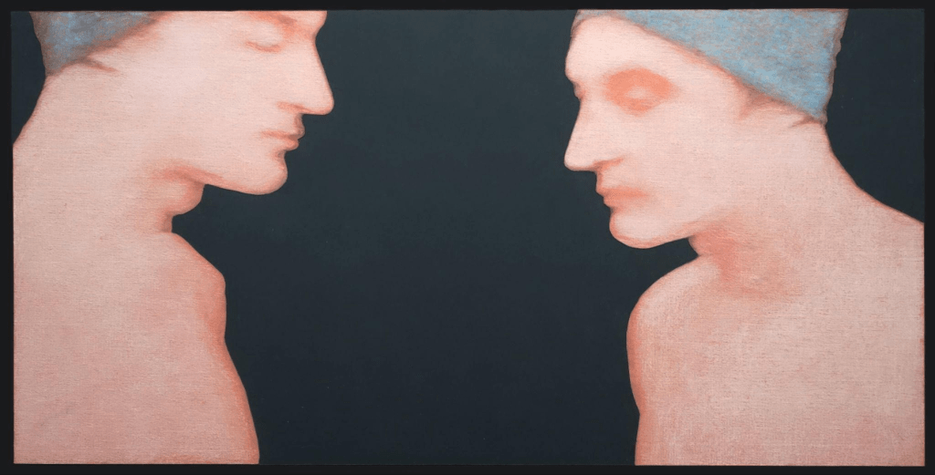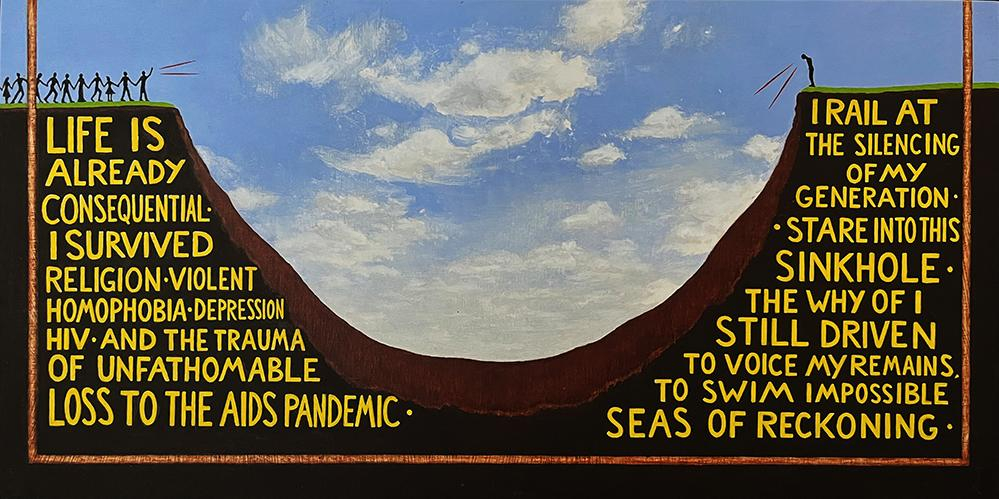 The sheer labor involved here is almost numbing. The amount of text and imagery on offer can feel overwhelming at first encounter. Viewers may find themselves stepping back, unsure how to proceed. That’s okay. It’s edifying enough to graze – to read a little, look a lot, read some more, and move on. The experience still lands. Trained originally as a visual artist, Kelly paints with a modernist, precisionist edge that evokes mid-century queer figures like Paul Cadmus, Jared French, and George Tooker – artists who feel less like influences than chosen ancestors.