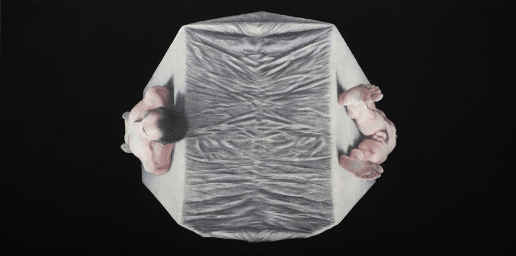Kelly’s visual vocabulary is largely drawn from his performance work and his cultural obsessions. “A Friend Gave Me a Book” takes the form of wall-mounted book pages, with hand-painted images and illuminated letters, telling the raw, poetic, and often uncomfortable story of his 2014 performance Escape Artist Redux. One of its most harrowing threads recounts a performance in which Kelly was channeling Caravaggio and fell from a trapeze, breaking his neck. Unsure whether he would ever walk again, he lay frozen, unable to move, obsessing over the small technical mistakes that led to the accident – foot placement, balance, timing. In the text and images here, and in a beautifully edited video montage drawn from the performance, that dread is palpable. His immobilized body, animated only by alert, searching eyes, asks us to imagine what it means not to know whether your physical autonomy has ended. The works derived from this moment retain that tension, even at a remove.