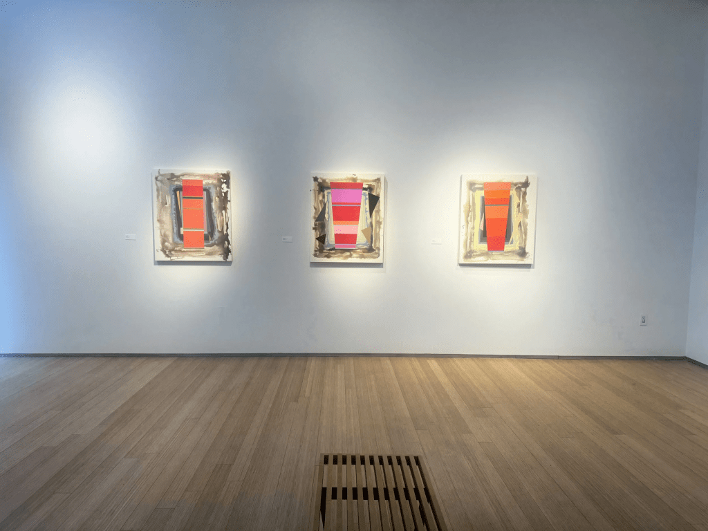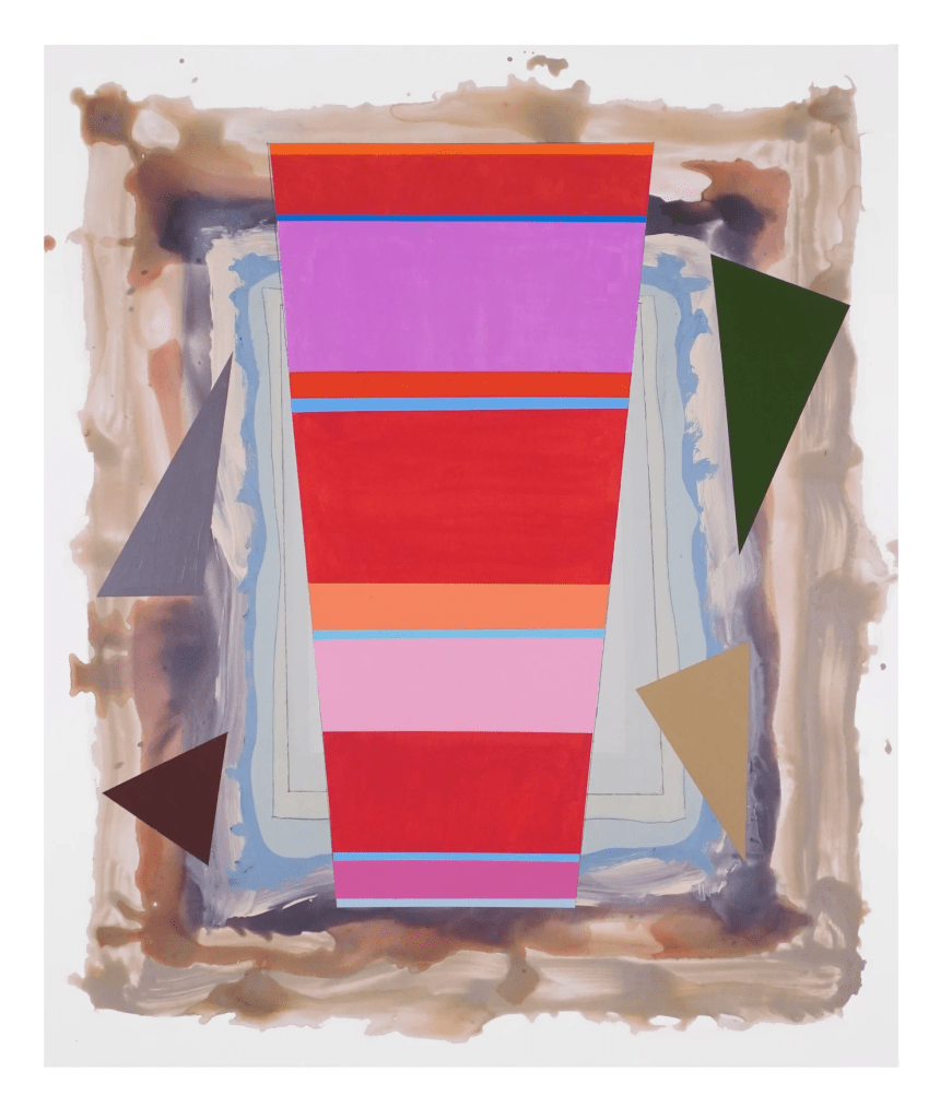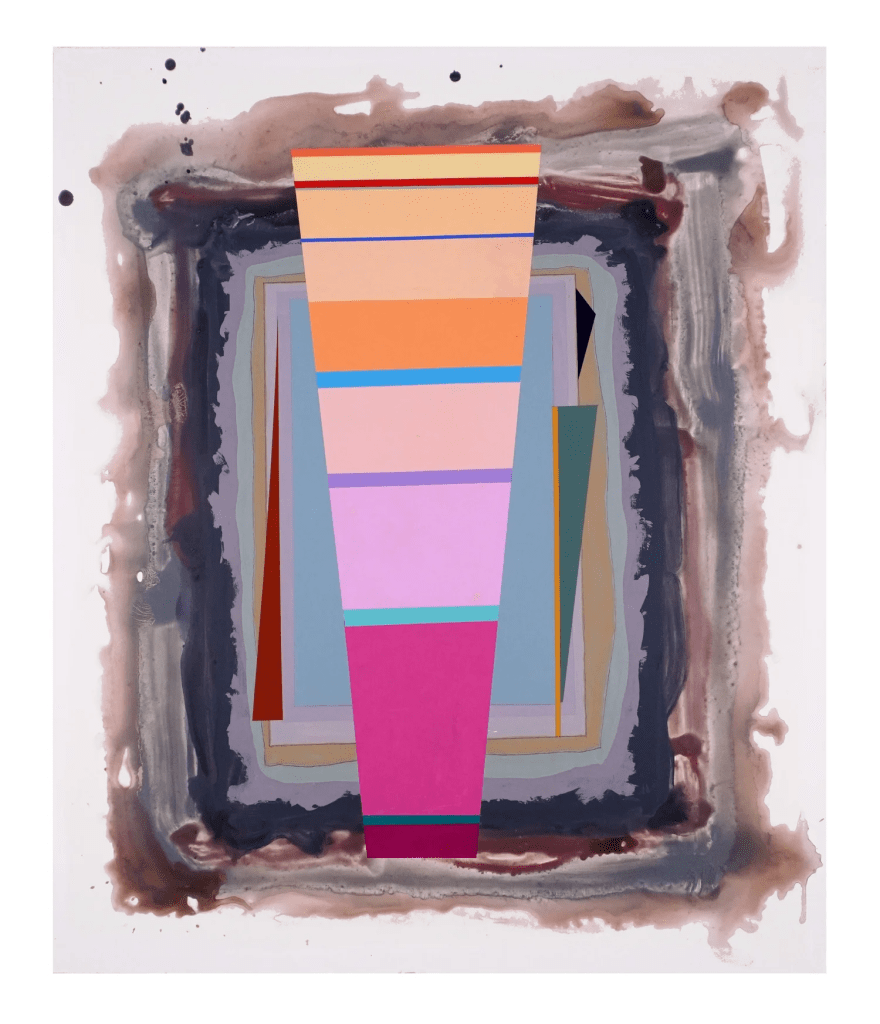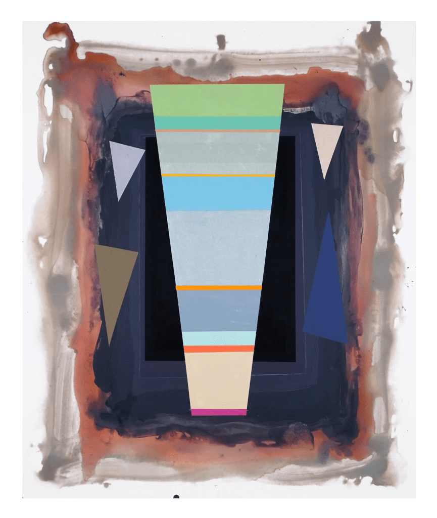 Contributed by Jonathan Stevenson / At Nancy Hoffman Gallery, Peter Plagens’ bracing new abstract paintings don’t so much as invite you in as dare you not to enter. Each canvas consists of three basic components: a painted frame of washy gray or brown; a pristinely rendered hard-edge shape, assertively opaque, centrally positioned, vertically symmetrical, and horizontally striated; and scattered, seemingly directional slashes. The second feature propels the paintings, but the other two steer them. The distinctly dilute vagueness of the frames might impart risk, the pesky shards impulse, and the vivid, intuitively color-coded ramps expansive fate – humble versions of Jacob’s Ladder, vouchsafing a future that need not be feared, at least distantly echoing one of Dave Hickey’s blithely peremptory and eminently arguable mantras: “Beauty is and always will be blue skies and open highway.”