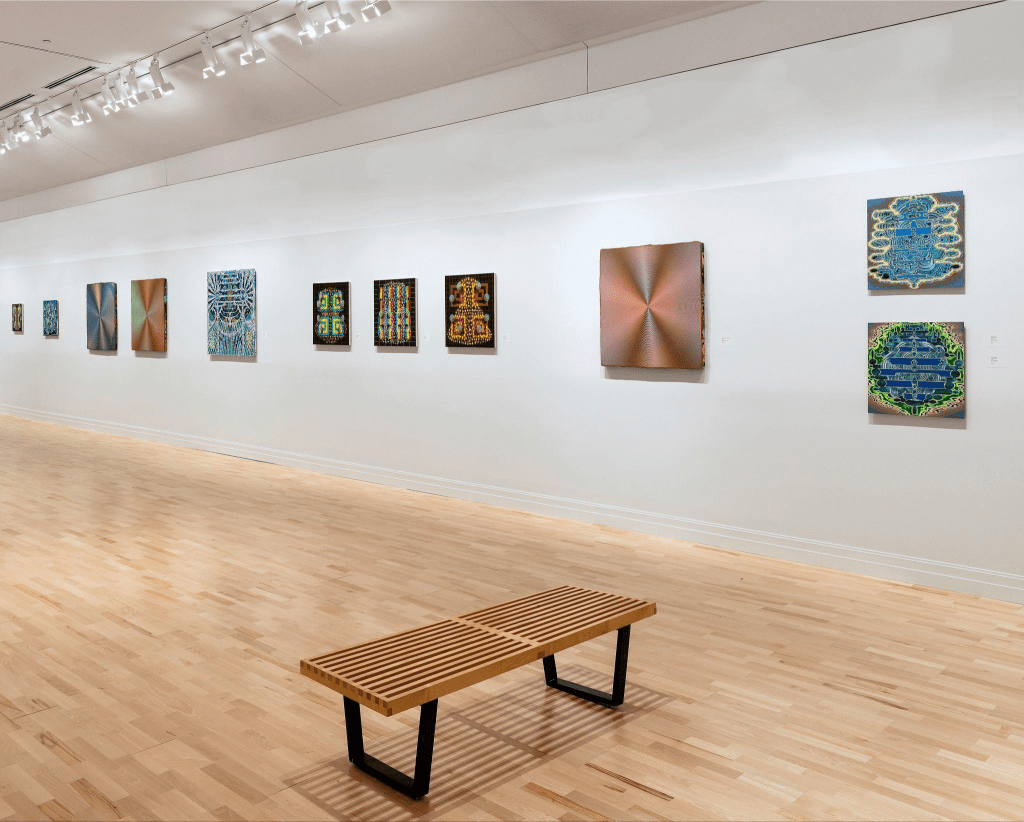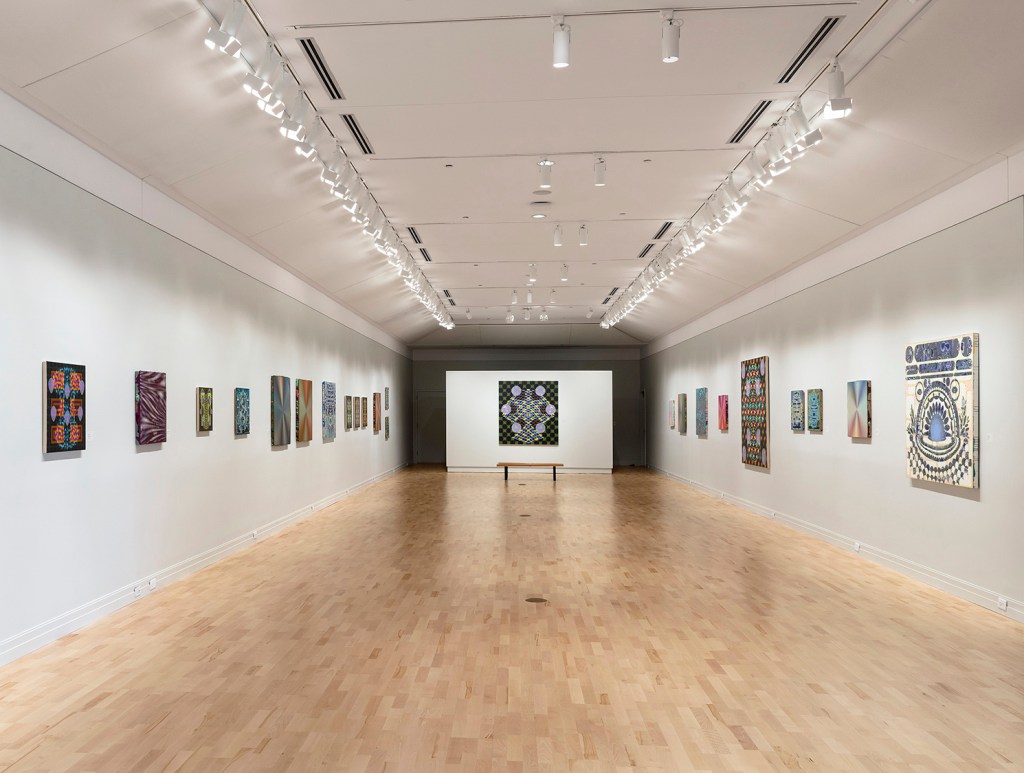 Contributed by Jacob Cartwright / True to its title, the group show “Precisely.” at Flinn Gallery is chockablock with precision-crafted paintings. There is an equal level of intensity across the three bodies of work—each artist delivers a jolt and seeing them together ups the ante. There are overlapping interests aplenty, centered around a shared investigation of brilliantly colored, pattern-based abstraction, with a flirtatious relationship to symmetry.