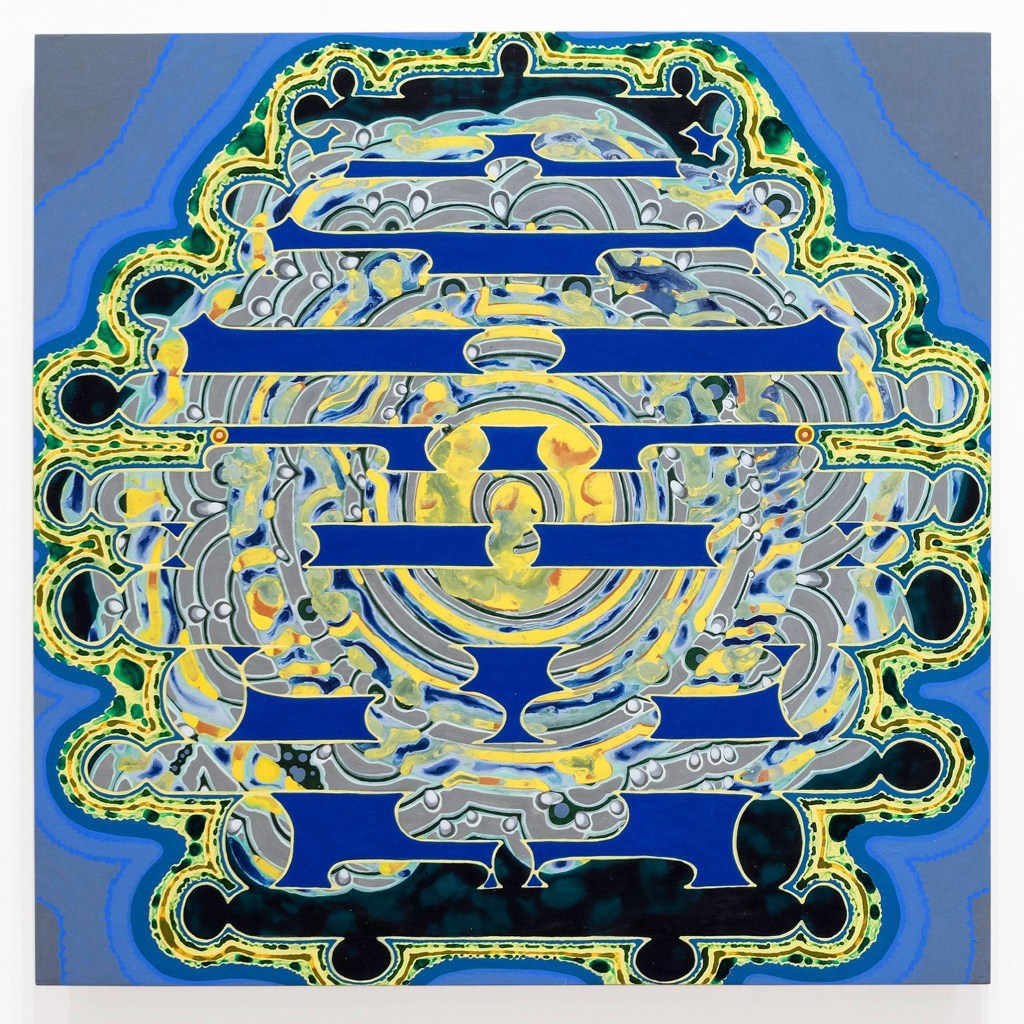 Sarah Walker’s paintings are like a dilated eye: they seem to let everything in. Her gusto for tightly packed detail yields images that read like MRI scans or the layers in cut agate. Her work reflects a sensibility, arising around Y2K, that is inspired by the proliferation of visual information as much as the history of painting. It is distinct from the approach taken by the Pictures Generation artists in its conviction that our technologically juiced-up culture of images has surged past interpretation or criticality. The paintings evoke vast amounts of data while avoiding overt technological signifiers: she has noted that her use of blue is tied to the even glow of LCD computer screens, and the paintings feel somehow aligned with the internet’s dissemination of pseudoscience, but these allusive associations are hardly didactic or prescriptive. Walker has a magpie’s eye for anything that looks interesting and cultivates her own kind of science fiction. She moves aqueous paint around her surfaces in a way that’s both free-flowing and highly guided, as if she is organizing petri dishes, or backlit screens, that are joined as leaded glass.