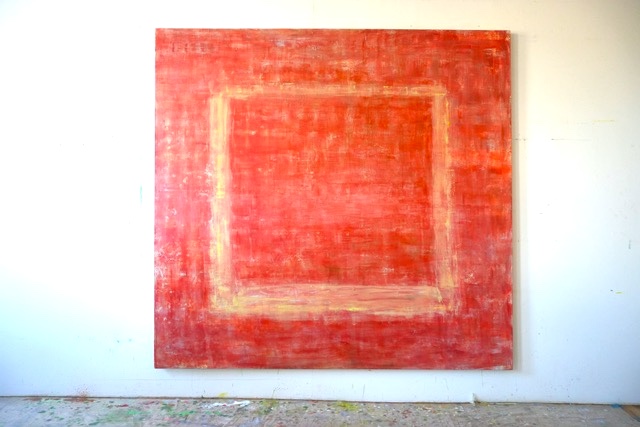 ST: I began working on a slightly vertical rectangle that was 84 by 80 inches. I wanted to represent time and the transformation of life when we pass away. My brother was in hospice at that time – he was dying. In making the painting, I was both with him in spirit and mourning the loss I was facing. He was only a year older than I was and when small we were, at times, like twins. I made a form in the center that referred to his physical existence. I changed its color many times. I painted a pale gray-white border all around it to signify a quiet and peaceful place. After much work, I was satisfied with the painting. My brother had passed away. He had not wanted visitors as he was dying. After looking at the painting for many days, I suddenly grew impatient with it. I should have waited. But I got to work making a new painting over the painting about mourning my brother. I turned the canvas around so that it was now a horizontal rectangle. I began by covering the first painting with glazes of green oil mixed with yellow. When this glaze was dry, I used Fauchon Red mixed with Carmine Red painted in a fairly thick coat over the field of green and yellow. I removed some of the not-yet-dry red paint while searching for a rectangular form in outline, which to some extent echoed the shape of the stretched canvas. But I wasn’t satisfied with the forms I was finding until I made it into a stage-like presence. It became more three-dimensional, but with only enough depth to suggest a figure-like form. I felt that I myself was then there in the painting.
