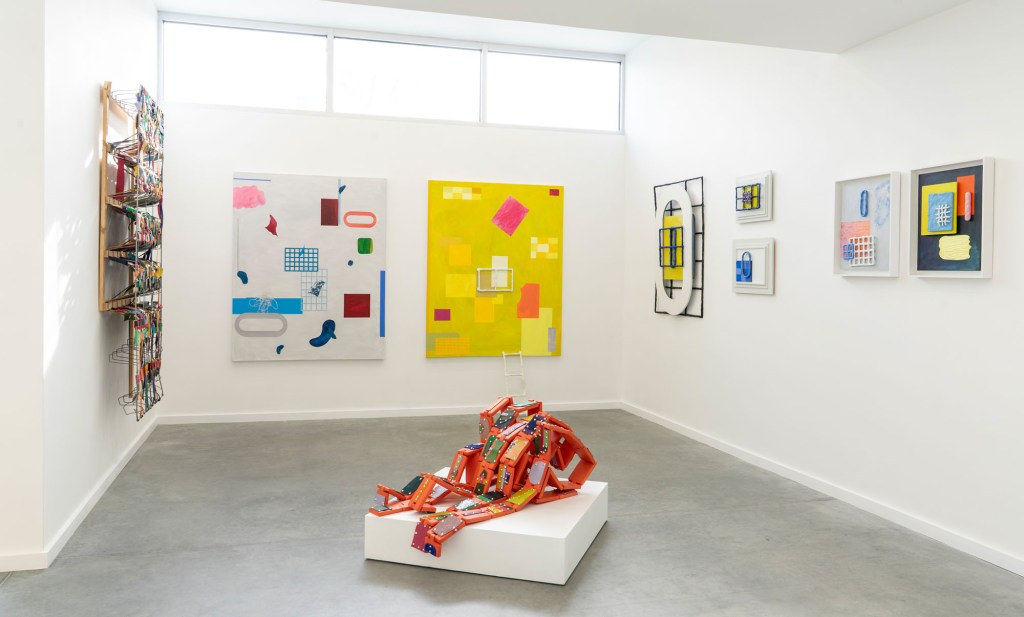 Owen: I find that figuring out how a form will hang, balance, or project from the wall can bring new ideas and meaning into the work. I encountered this last summer while installing twenty-seven works, discovering that inserting wire brads allowed each piece to hover slightly off the wall. What I loved most, though, was how that installation became a kind of mapping. Seeing the works together allowed me to understand relationships that I couldn’t see in the studio. Returning to canvas for this exhibition, I hoped to engage painting more traditionally. Instead, I kept adding objects and grids, resisting the constraint of keeping the work purely a “painting.” Eventually, I realized I was arranging shapes on the canvas the same way I had used the wall at Art Cake, treating the surface as a site of relationships.