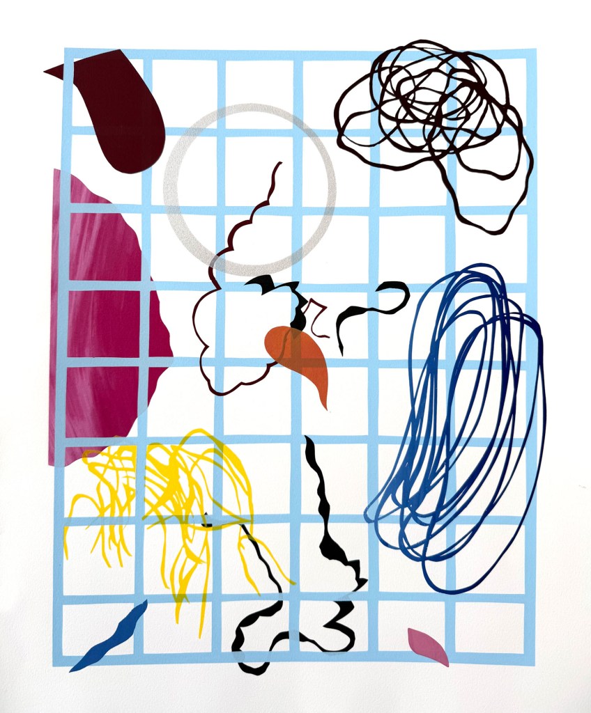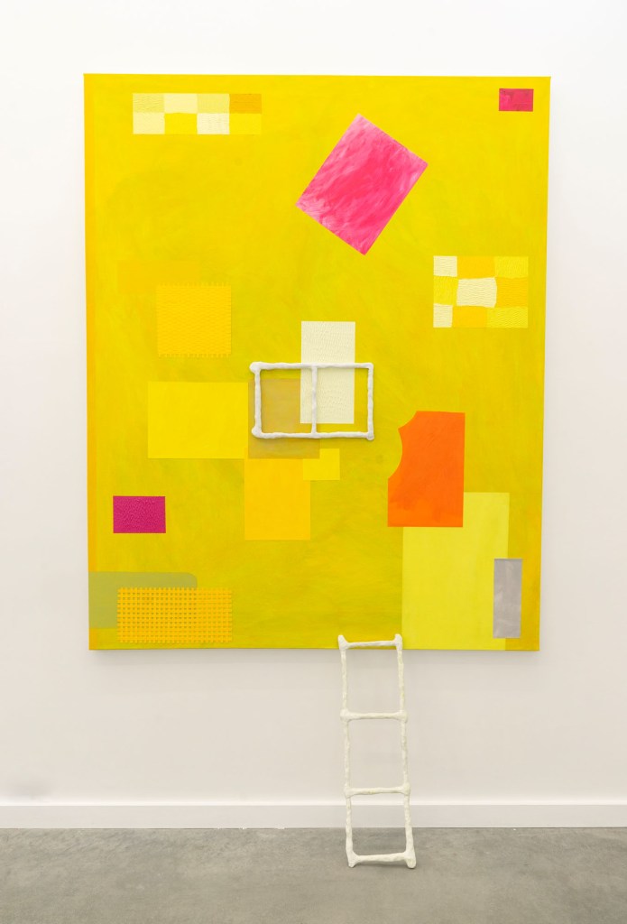 Baldwin: I’m struck by the atmosphere in the new works. In Clairvoyance, the canvas becomes a field we can inhabit, and that’s complicated by the material variation of the other elements, from the epoxy clay ladder and gate forms to the intricately woven grids and the textural patches that read like keys. I’m particularly drawn to the blue form in Thought Shapes.