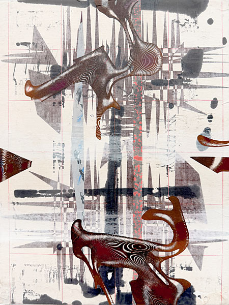 Contributed by Jonathan Stevenson / The lithely flirtatious and somewhat Boschian primary elements in Jeffrey Bishop’s acrylic-and-collage Sidewinder series of screenprint-painting-collages – now on display at McKenzie Fine Art – are centered, unabashed things-about-town, decidedly abstract but, in their verticality and jazzy affect, firmly digital-biomorphic. Depending on ambient color, line, and pattern, one could scan as a pterodactyl, a seahorse, a climbing vine, a dog leaping paws-up to its master, a rearing ram, a cockroach, a pole-dancer, Daffy Duck, or The Thin White Duke. Gently increasing the sense of gravity, a tandem of acrylic-and-ink paintings from the Fathom Compression series seems to meld the humanoid and the geological, not unlike Hilary Harnischfeger’s uncannily integrated ceramic sculptures and reliefs (currently on view at Uffner & Liu). These two series are handsomely grotesque and vice-versa, combining the graphic precision of Pop Art and the psychedelic sensibility of Surrealism. His work from the Interval series, also acrylic and collage, is more sedate and referential, one canvas perhaps even Christological, but all four pieces retain the out-there vibe of dimensional permeability.
