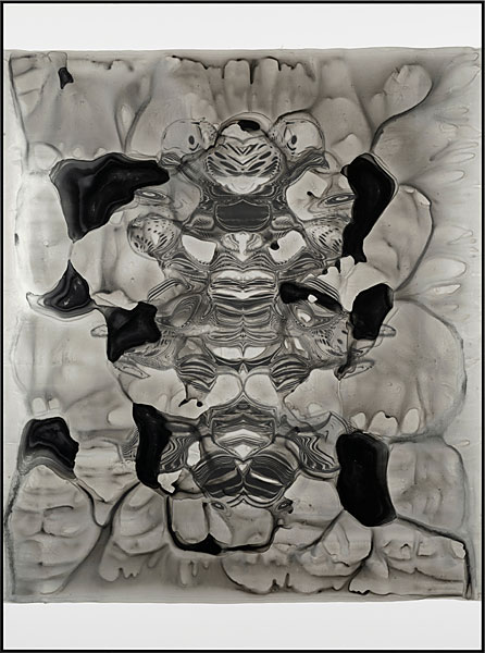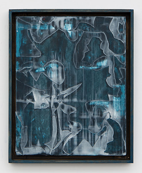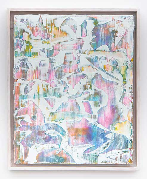 Mason Dowling has a complementary but similarly restive attitude. If Bishop is interested in strange creatures’ infiltration into this world, Dowling may be looking to decipher familiar ones’ efforts at exfiltration from it. Ghosts or the undead are everywhere in his tactile acrylic-and-paper paintings, perhaps most overtly Chimayo, Ptarmigan, Revelator, and Tinkertown. Like Bishop’s abstract entities, Dowling’s apparitions are invariably in motion, but beneath a suppressive veil. The visual resonances are clearly anthropological as well as geological and cosmological, lending the work historical weight next to its transcendental quality. In works like Barnacle Candy and Waltzing with Bears, color, line, and Dowling’s distinctive painterliness bring these qualities together most vividly, whereas Color Confinement provides an austere counterpoint, as if to demonstrate the denuding quality of obfuscation, denial, or sublimation.