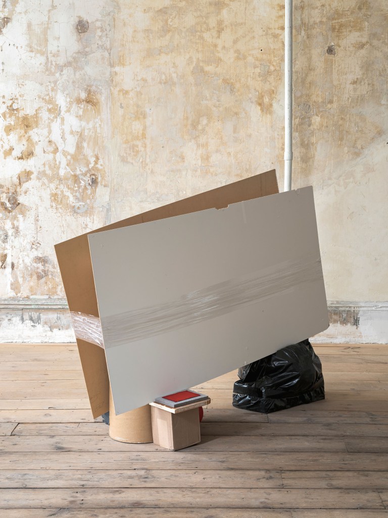 First Layer of Revelation, 2026, hardboard, foam, wood, cardboard, fabric, acrylic paint, plastic, found objects, 50 x 64 x 30 inches (photo credit: Sebastian Bach)