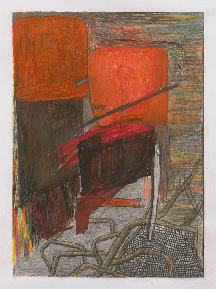 Brenda Goodman’s small mixed media contribution features two blocky orange forms resembling boxing gloves atop thrusts of dark brown. Standing vertically, this couple seems to be whispering to each other. Mangled bands resembling rebar lie scattered along the bottom right quadrant and frame a delicate grid (a discarded chair?), suggesting an earlier accident or confrontation. Hovering in the bottom left corner, a fiery multi-colored explosion acts as a gentle spirit watching over the scene.