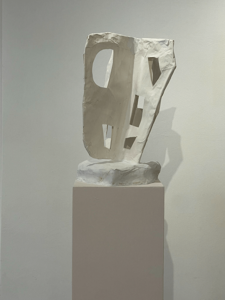 The only artwork standing alone and away from the wall is Tamara Zahaykevich’s sculpture. On top of a milky pink pedestal sits a milky white structure I can best describe as Siamese twin butterflies. A few clean shapes are cut from their wings in no particular pattern, allowing us to see right through. This piece changes as you walk around it, becoming gray against sunlight pouring from the windows and bone white against the gallery interior. It’s almost like an open book, with certain passages redacted in negative space, yet it displays itself with a sense of pride. This dichotomy brings me back to the Millay poem, with memories of a rainy day and a tiff, later contrasted with the author’s recollection of the spiteful “you/As a singing bird.”