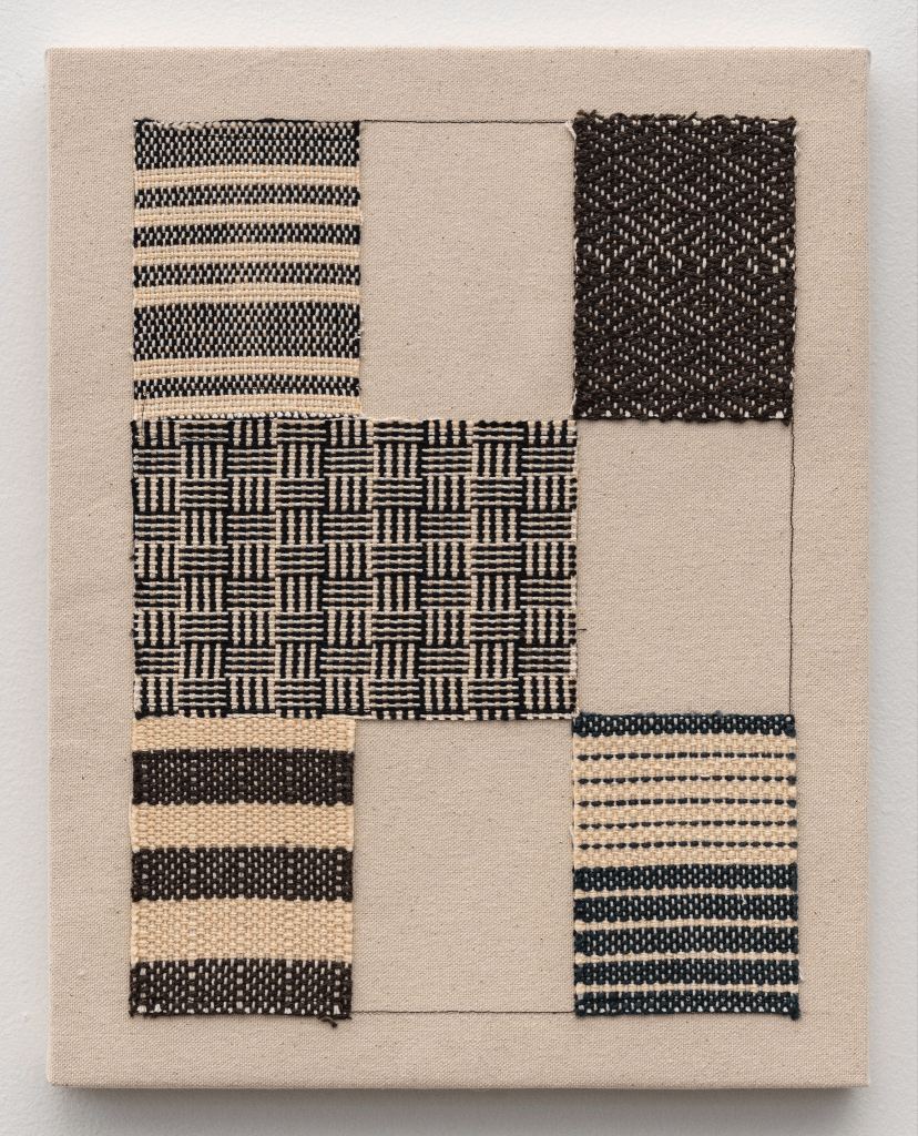 Paolo Arao, Polyrythmic Study (BW2), 2023, Handwoven cotton thread collage on canvas mounted over wooden panel, 14 x 11 inches