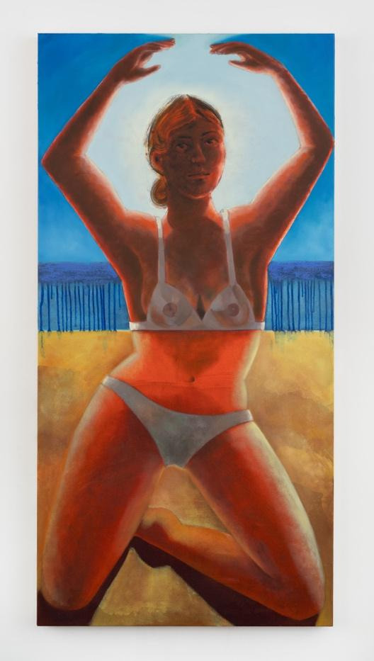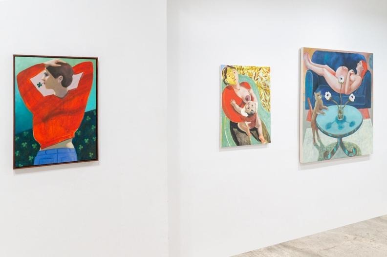 Mancini draws on the rich history of maternity and the female gaze, the slightly distorted figures aligning with those of contemporary artists such as Danielle Orchard, Julie Curtis, and Elizabeth Glaessner: dreamlike realities that transcend linear time and reflect subconscious desire and sensuality. Mancini resists particular interpretations of intimacy, nurturing, or self-actualization, instead embracing universal contradictions. Human-sized vertical canvases contrast with close-up portraits. At the far end of the gallery, Sun Catcher appears like an altar presenting a heavenly, monumental figure, an oracle or a sun goddess. The figure holds the light and faces us directly, embodying creativity and world-building in an iridescent, glowing body. Edges bleed, congeal, and disperse at uncanny moments while body parts touch, almost touch, meet, almost meet, implying opposing sensations of tension and release.