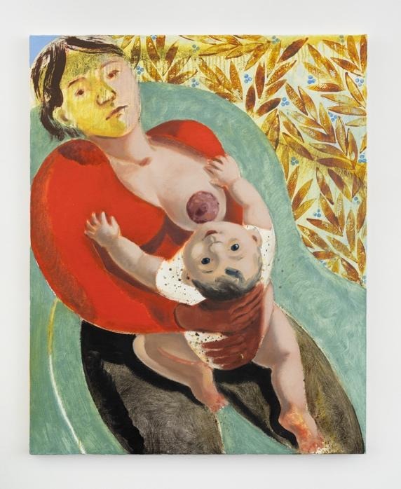 Mancini’s two versions of mothers nurturing children impart the complexity of caretaking relationships. At first glance, Night Shades seems to allude to Madonna and Child. Subverting this allusion are deep maroons and greens, exaggerated arms with flattened outlines, deadly flowers, and an exhausted expression, honoring the reality of a mother’s tender heartache, as seen in the Pietà, the work of Käthe Kollwitz, and that of Elizabeth Catlett. Still Nursing portrays a joyful baby as the mother recedingly looks aside. Patterns, drips, and colors surround a highly textured areola, the painting’s focal point. Here Mancini emphasizes the functionality of the female body as nourishment becomes labor and intimacy service, while capturing fleeting moments of idealized domesticity and mixed emotions with deft brushwork and compressed spaces.
