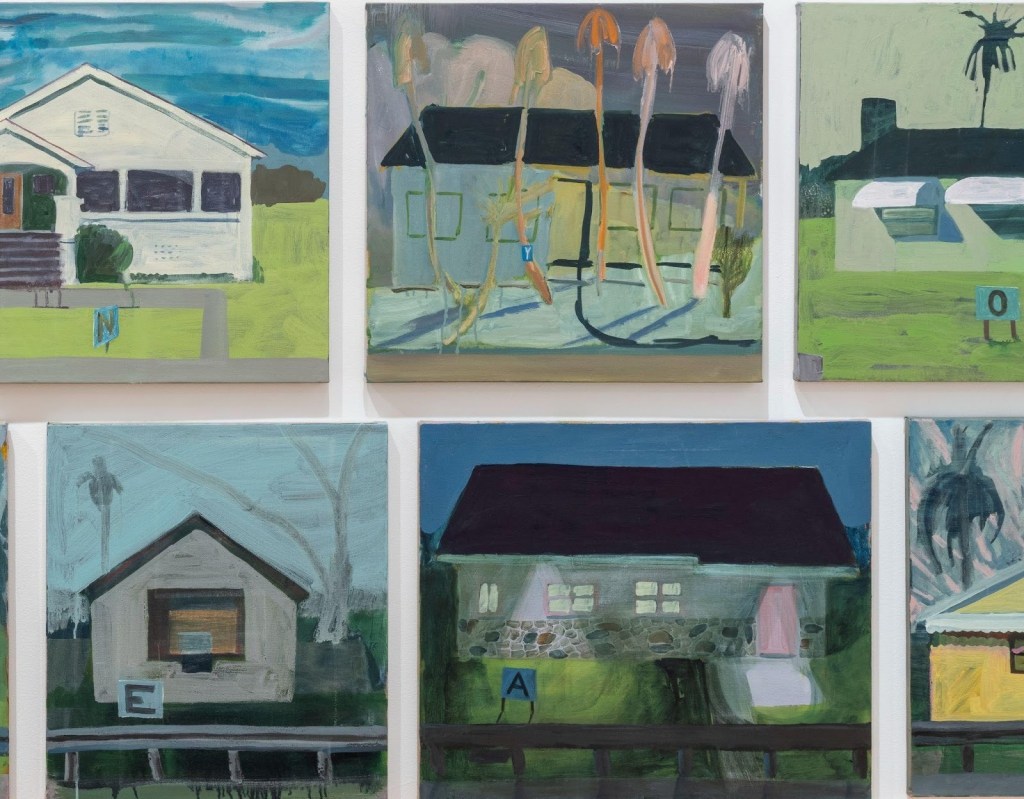Matt Bollinger: Monsters Live in Your Head is made up of 21 canvases, each with the façade of a house and one or two letters painted into the scene. They collectively spell out the title of the painting. Could you talk about how you’re thinking about “home” or houses in this exhibition?
