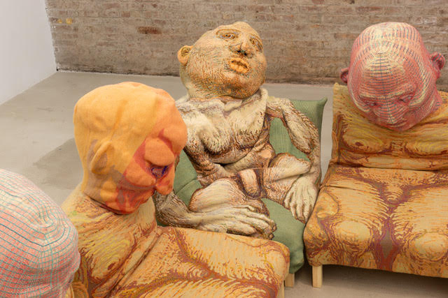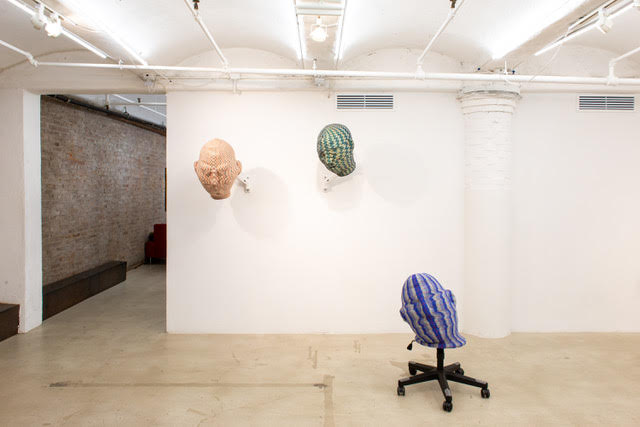 The figures are fabricated using a computer-programmed Jacquard loom, producing custom textiles that define the heads in both flat pattern and dimensional form—eyes and ears woven directly into the surface—before being stuffed and mounted like hunting trophies. One orange-headed figure sprouts a quasi-body on a wooden post, draped in a “skin” complete with nipples and body hair—an unmistakable Silence of the Lambs shiver. Most of the others perch on TV wall mounts or a rolling gaming chair base. The latter feels especially pointed: the dedicated gamer’s throne, designed for total immersion, for the suspension of bodily awareness in favor of digital worlds. Losing one’s corporeal sense to cyber realities hums as a subtext throughout.