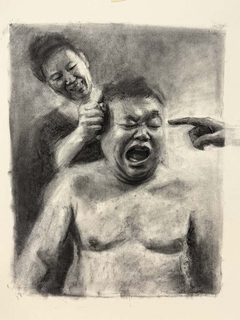 Portraiture – representation at its most unabashed – gets its due. Fabian Pearl’s two untitled self-portraits are radically different in style, one ethereal but literal and the other enshrined but distorted, yet both cast a wistful look to the past. Stripes and Forgiven – Chris Herrera’s achingly realistic drawings of a Black man in full profile and a white woman with head turned away, respectively – seem resolutely in the present and provocatively juxtaposed. Xiya Wang, in her painting In Motion and drawing No Love Like Family, casts a sharp eye, by turns noirish and sardonic, over timeless gender and domestic tropes. There are innumerable parameters for teasing out a group show – line, color, shape, school, style, content, and many more. Adhering too closely to any one of them can spell dull rigidity, not closely enough exasperating dissonance. White has vaulted over these pitfalls by focusing on how the vibe of each artist overlaps with those of others.