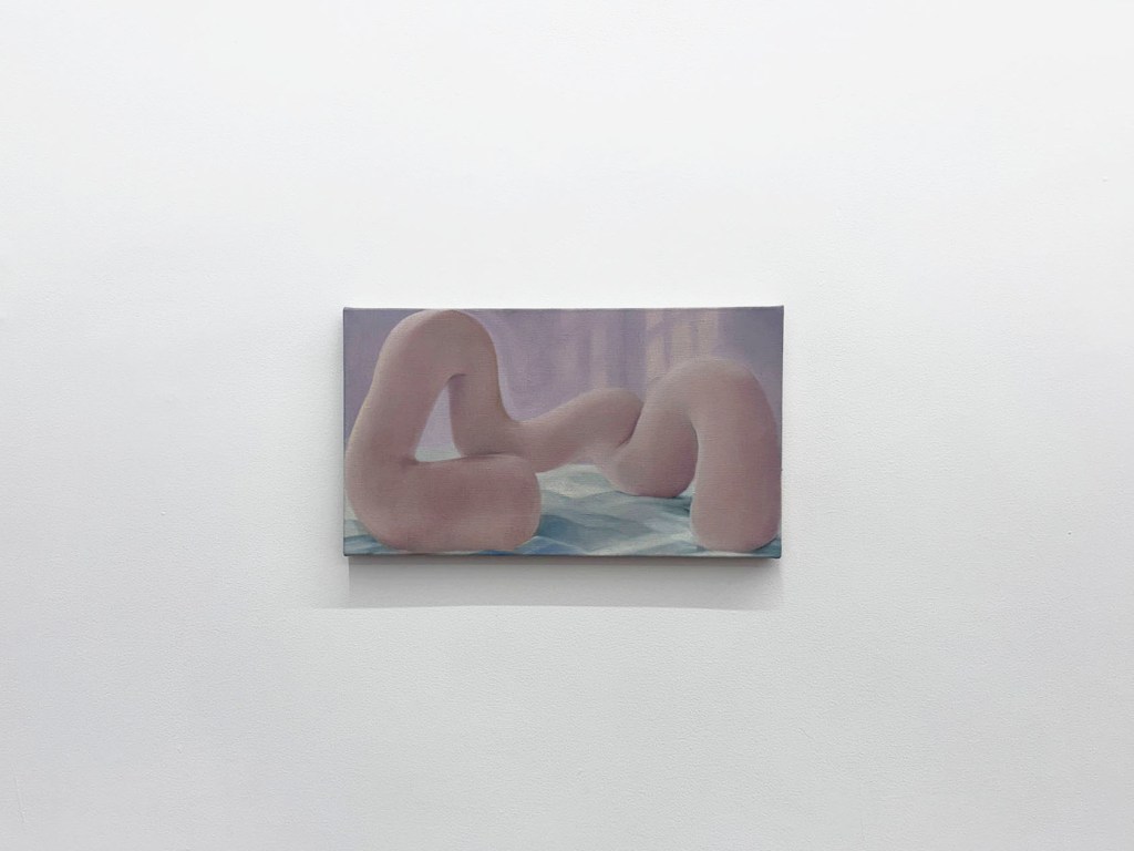 C Lucy Whitehead’s paintings are gentle meditations on bodily form. With Sarah Lucas’ recent resurgence, it would be easy to cast Whitehead’s paintings as pictorial depictions of rehashed, floppy, abstracted Your Bizarre Adventure bodies of old. But gauzy light bathes the velvety surfaces and fuzzy edges, affording the work an uncannily seductive quality. Beautiful and curious, they summon the kind of chance encounter shown in a Trisha Donnelly piece rather than, say, a staged meeting à la Hans Bellmer.