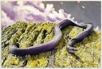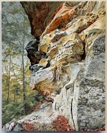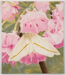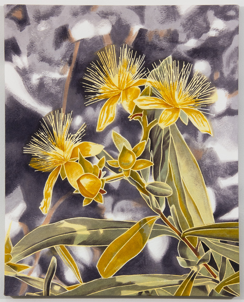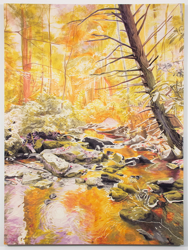 Working from direct observation in biologically diverse public parks and wilderness areas, she makes paintings that fuse her concerns about ecology and her penchant for handmade materials with landscape painting. She makes her own paint by extracting dyes from locally foraged and cultivated materials. Unlike conventional pigments, organic colorants are regenerative and biodegradable, so they continue to morph after the artist has finished her work, shifting and deepening over time, giving each painting a developmental lifespan of its own.