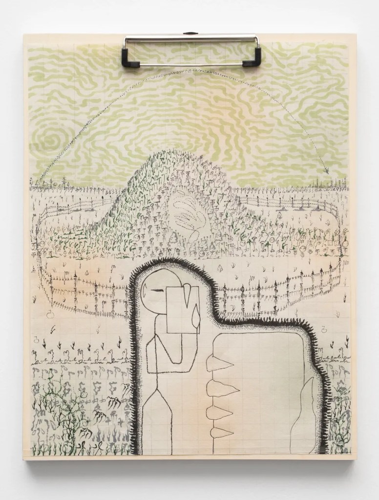 Since I arrived before Food opened for dinner, I decided to stroll around the neighborhood and found Hyacinth, a space vying for the title of the smallest gallery in New York City. With mega galleries putting on so many fantastic exhibitions, it’s difficult to carve out time for just wandering and discovering these smaller, out-of-the-way spaces. Inside Hyacinth was the work of Mitch Patrick. I had previously seen a piece by him at Platform Project Space in Dumbo. It held my attention as I wasn’t sure what exactly I was looking at. Conversing with other artists at the opening we surmised that, though flat, it could be a type of 3D printed mark-making on a semi-clear sheet, or several sheets of material sewn together, with collage elements. High and low tech. The works at Hyacinth were likewise covered with red asemic digital “writing.” In the Platform exhibition, the work was suspended away from the wall so that one could see through to the space behind it. Here, while still visually intriguing to look at, the “drawings” were mounted on wooden clipboards, which made for a disjuncture of sorts, evoking the past/present/future ruptures in the film Brazil by contrasting the allure of current tech with the banality of the almost forgotten clipboard.