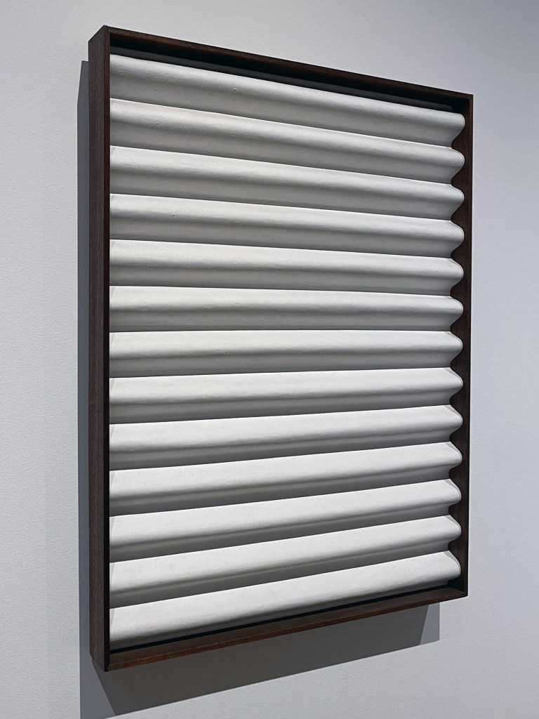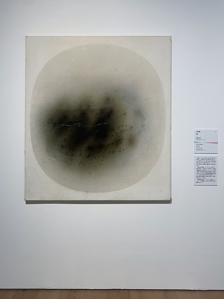 Nomura Ko’s Memory of Memories compresses perspective in its cavernous view of “all things lost” to the void, or perhaps, cast directly into the subconscious. Later, in near total darkness, the subdued organic geometry of Mikami Makoto’s Symbol of Reincarnation evoke the closed-eye hallucinations of LSD, à la Miro’s and Kandinsky’s abstractions. Still, Mikami holds onto the shibui-beige color palette derived from tea ceremony. Leaning in and I can’t help but associate the imperfect bullseye embedded towards the top with Kenneth Noland’s iconic Birth. Ono Hidetaka’s Circle, advances the rounded motif with stillness and empty white space (yohaku) that appears celestial and atomic, smoother than but similar in feel to Jay DeFeo’s The Rose and in turn Franz Kline’s Mahoning. Sakaki Ken’s Opus.63-4, featuring glossy, raked-gravel minimalism, is another standout.