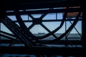 Contributed by Iris Cushing / Donna Dennis is an artist of transition and transformation. Her architectural installations – which she pioneered in the 1960s and has continued to develop – often take the shape of transitory sites: subway stations, hotels, tourist cabins, and, in the case of her show “Ship/Dock/Three Houses and a Night Sky” at Private Public Gallery in Hudson, a loading dock. Like much of Dennis’ work, this installation draws on her experience and observation of vernacular spaces. It evokes industrial structures on the shore of Lake Superior, where the earth’s minerals are loaded on freighters by the ton and transported over water. This work marks the first time in Dennis’ expansive career that she’s combined three-dimensional architecture with painting. In merging the two media, she seamlessly creates a world for viewers to dream into.