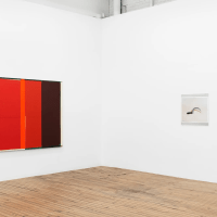 Contributed by Jacob Patrick Brooks / Consider the hunk as a deliberate, usable form, as Julia Rommel does. Her paintings are hunks of color painted on linen – cut up, unstretched, and stapled into off-the-air color TV bars. They are as much about labor as color. Each painting feels as though it was sledgehammered into the wall just before you walked in the room, still ringing from the strike. Flanking Rommel through the show is Lucas Blalock, photographer. His photos operate similarly, offering an easy, even fun, seduction that segues into discovery as you find out how he’s tricked you. Images are cut and layered over one another, details are hidden. The viewer is rewarded for close, patient attention, as in an I Spy book.