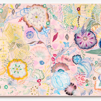 Contributed by Lucas Moran / “Always Were” is the title of Opal Mae Ong’s solo show at Plato Gallery. It’s a compact declaration – two words that look both forward and back. The work does the same. Old ways, rituals, medicines, and inherited knowledge blur into future or parallel worlds: gradient skies without brushstrokes, glowing plants, and figures who bathe, offer, watch, and mourn. Grief is a constant presence here – not as melodrama but as a condition with the same dignity and value as joy or love. Ong treats all of it as coexistent. Nothing replaces anything.